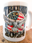 Start your day with a dose of humor and a hot beverage in our "Trump 2024 Eagle Flag" coffee cup. This 11-ounce sublimated mug is perfect for those who love to make a statement while enjoying their favorite drinks.
