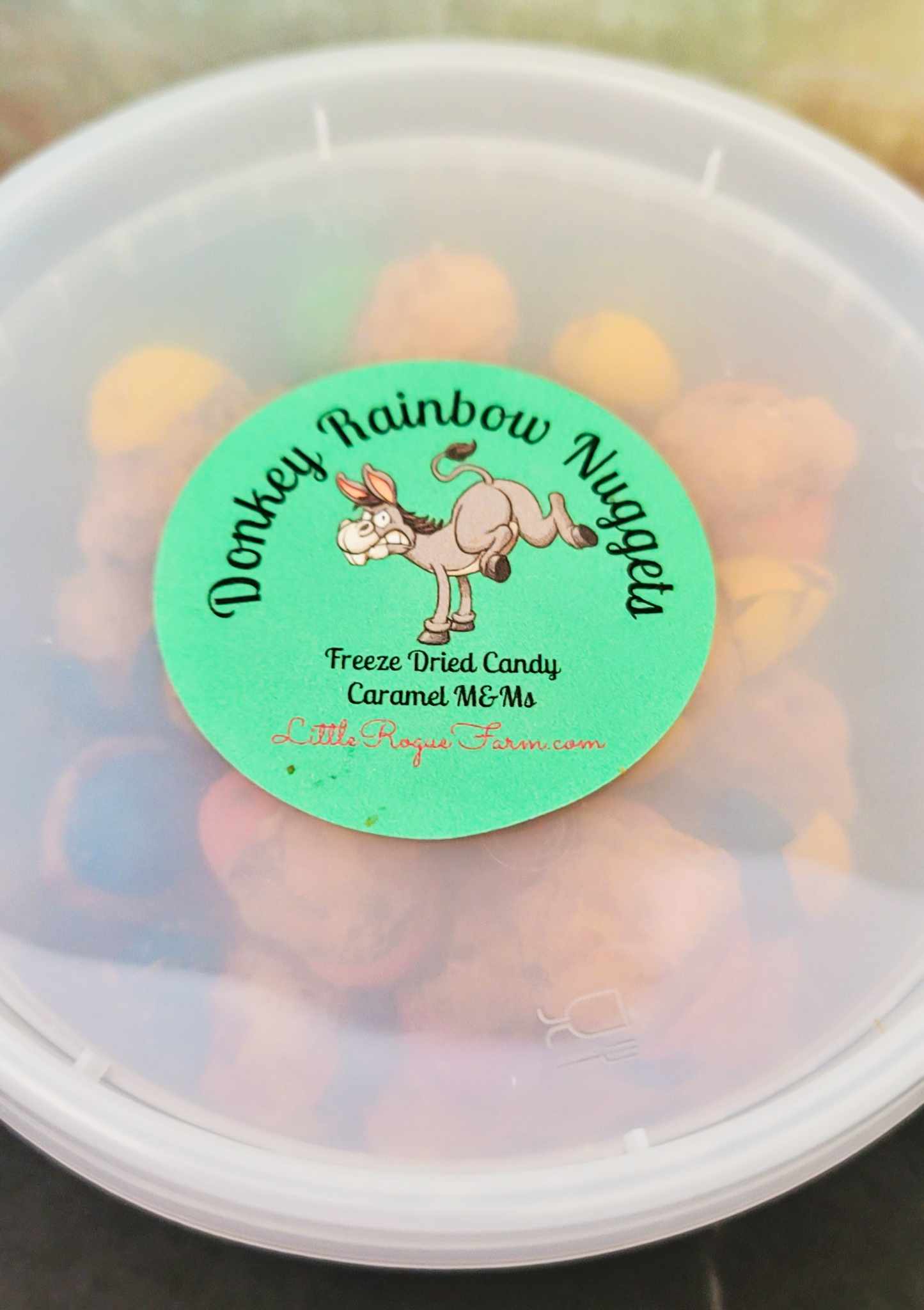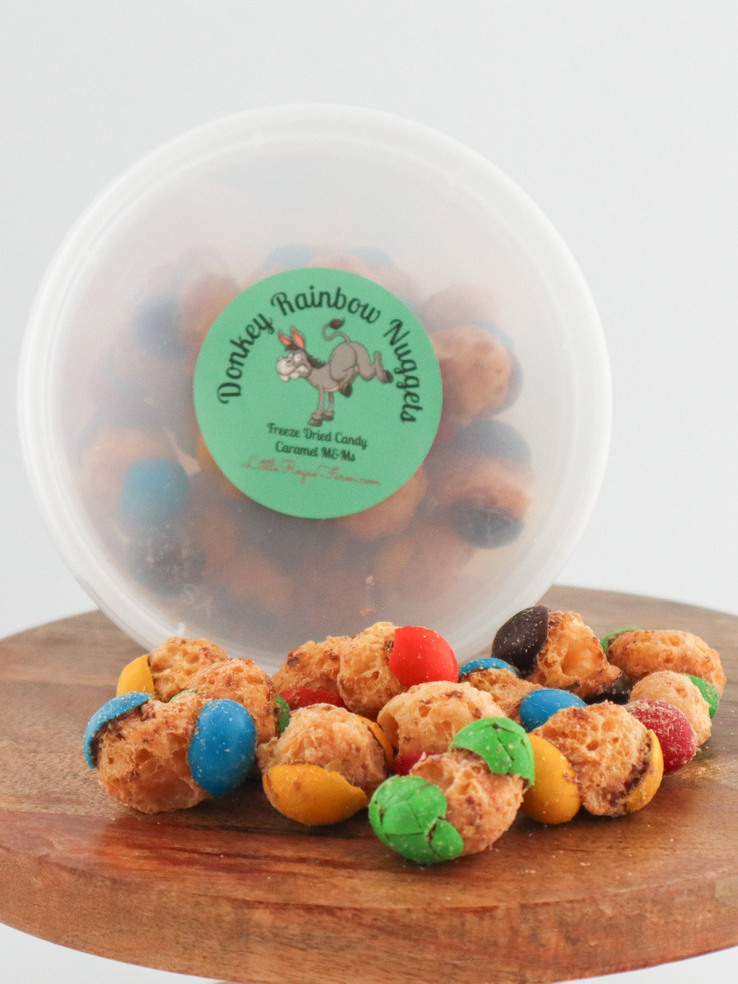 - Donkey Rainbow Nuggets: These are freeze-dried M & M Caramels candies. Net weight varies from 2.3 to 2.8 ounces.
